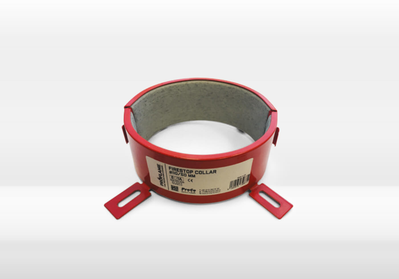 Duvar ve döşeme geçişlerinde yanıcı boruların çevresine yerleştirilerek 4 saate kadar yangın yalıtımı sağlayan, metal muhafaza içerisine yerleştirilmiş intümesan özellikli durdurucu kelepçe.
